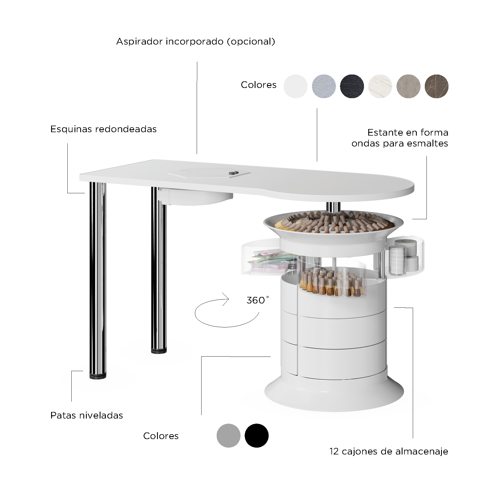 Accesorios opcionales: Permite incorporar aspirador de uñas y pasa cables (opcionales) para maximizar funcionalidad.